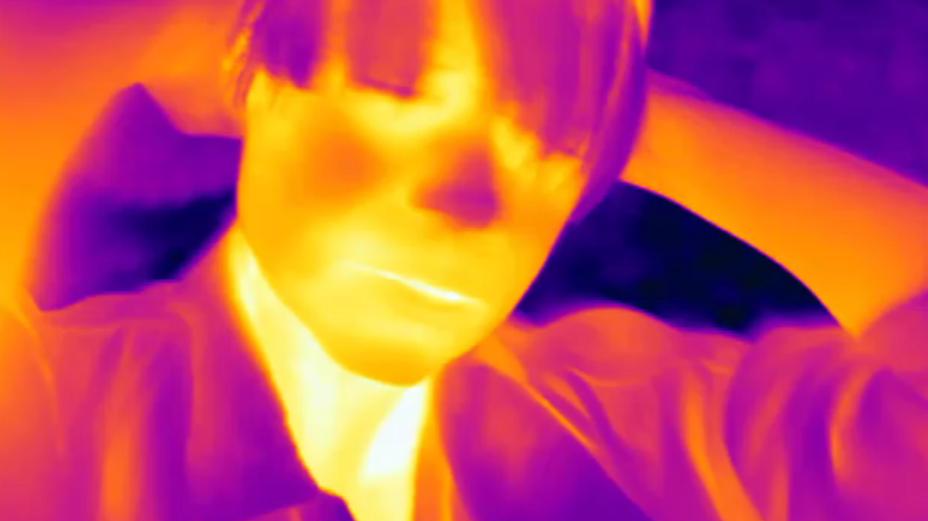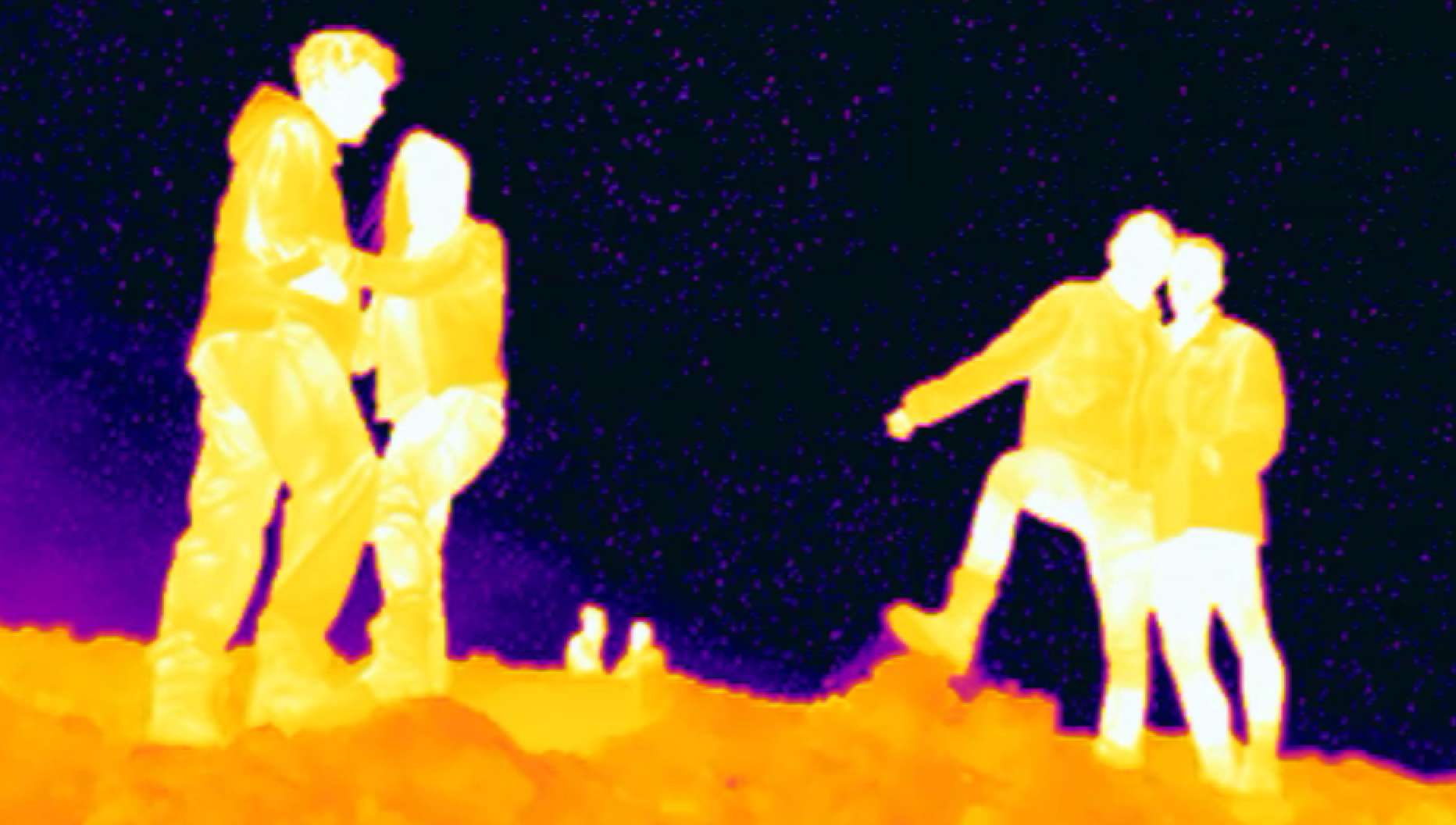 BODY HEAT is the thermographic videoportrait of a gang of night-goers. They play, they provoke, they rave, and they flirt. They let the attraction between their bodies happen, allowing movement and desire to melt into one collective ritual. The thermographic camera captures the physiological temperature of their dance and that of their emotionality, too.